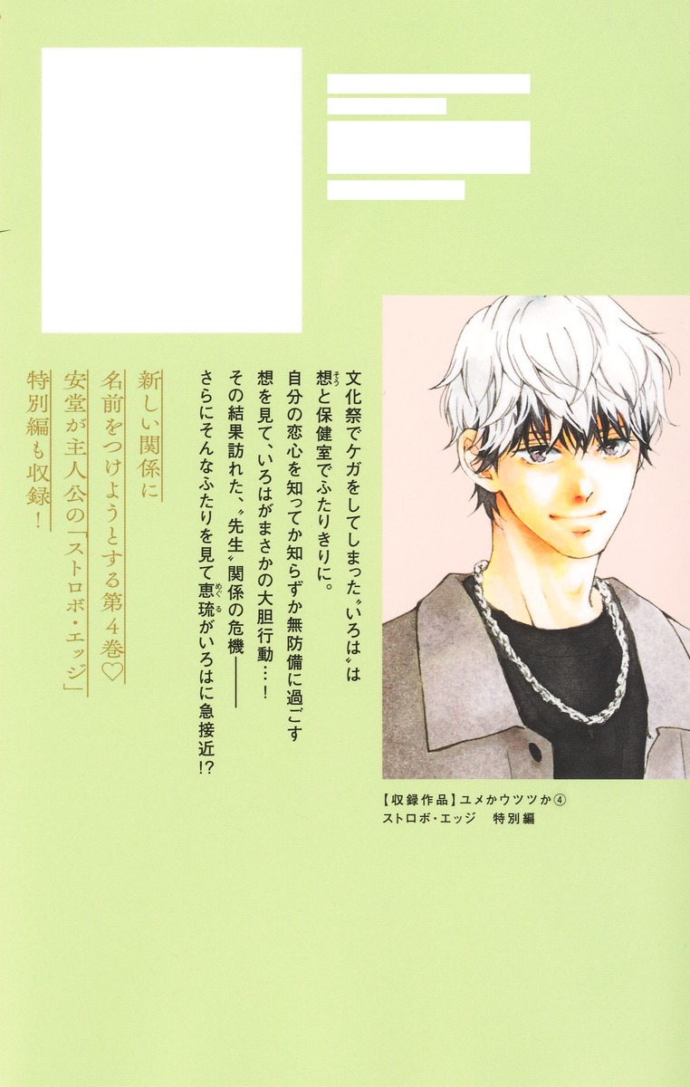 文化祭でケガをしてしまった“いろは”は想と保健室でふたりきりに。自分の恋心を知ってか知らずか無防備に過ごす想を見て、いろはがまさかの大胆行動…! その結果訪れた、“先生”関係の危機──さらにそんなふたりを見て恵琉がいろはに急接近!?新しい関係に名前をつけようとする第4巻 安堂が主人公の「ストロボ・エッジ」特別編も収録!【収録作品】ストロボ・エッジ 特別編