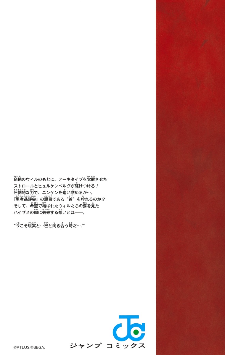 窮地のウィルのもとに、アーキタイプを覚醒させたストロールとヒュルケンベルグが駆けつける! 圧倒的な力で、ニンゲンを追い詰めるが…。『勇者品評会』の題目である“首”を狩れるのか!? そして、希望で結ばれたウィルたちの姿を見たハイザメの胸に去来する想いとは──。