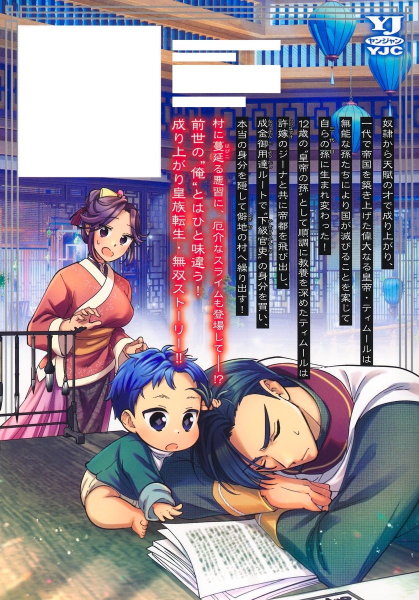奴隷から天賦の才で成り上がり、一代で帝国を築き上げた偉大なる皇帝・ティムールは無能な孫たちにより国が滅びることを案じて自らの孫に生まれ変わった! 12歳の“皇帝の孫”として順調に教養を深めたティムールは許嫁のジーナと共に帝都を飛び出し、成金御用達ルートで“下級官吏”の身分を買い、本当の身分を隠して僻地の村へ繰り出す!村に蔓延る悪習に、厄介なスライムも登場して──!? 前世の“俺”とはひと味違う! 成り上がり皇族転生・無双ストーリー!!