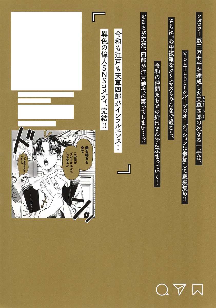 フォロワー数三万七千を達成した天草四郎の次なる一手は、YouTuberグループのオーディションに参加して家来集め!! さらに、心中複雑なクリスマスもみんなで過ごし、令和の仲間たちとの絆はどんどん深まっていく! ところが突然、四郎が江戸時代に戻ってしまい…!?令和も江戸も天草四郎がインフルエンス! 異色の偉人SNSコメディ、完結!!