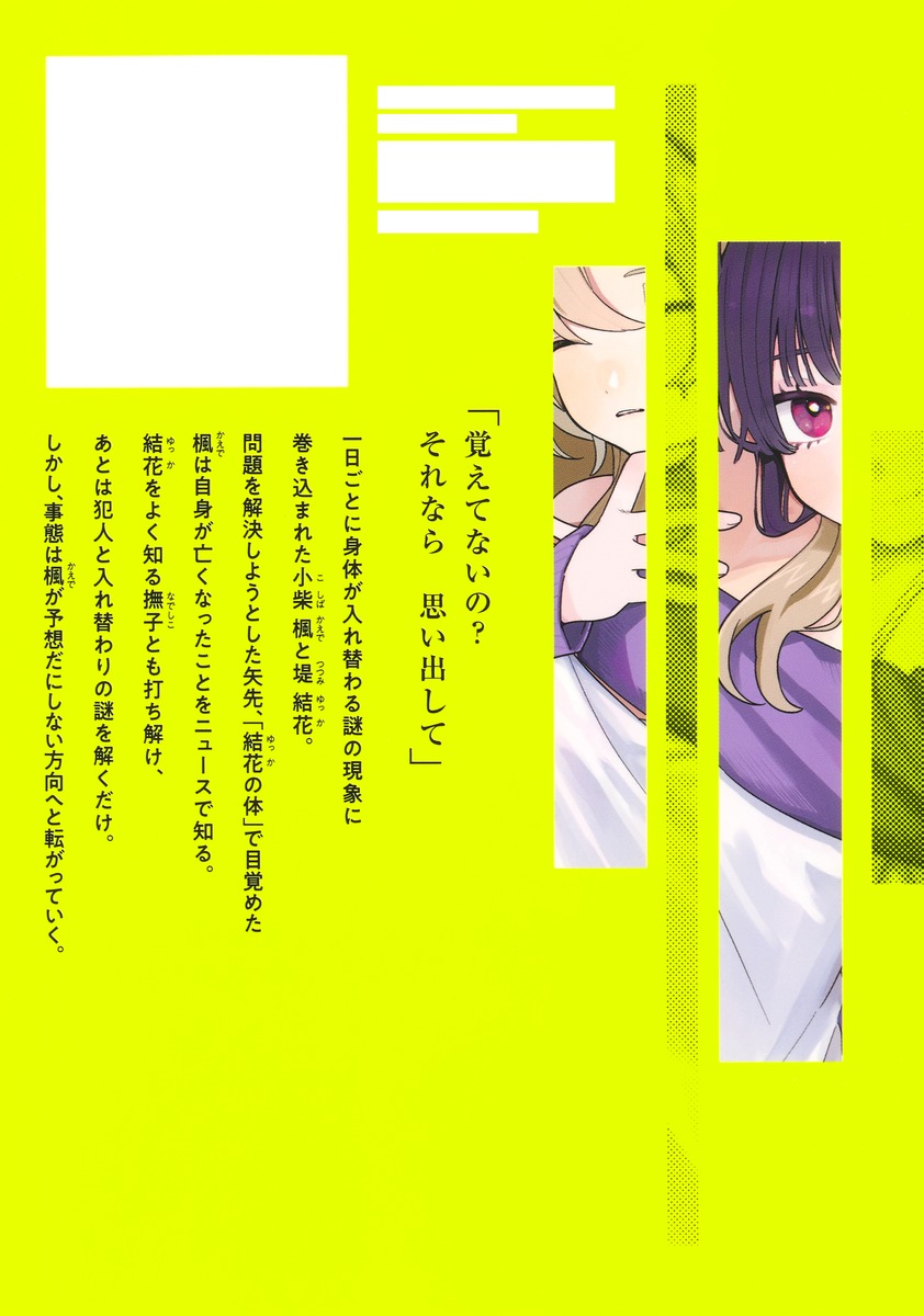 「覚えてないの? それなら思い出して」一日ごとに身体が入れ替わる謎の現象に巻き込まれた小柴楓と堤結花。問題を解決しようとした矢先、「結花の体」で目覚めた楓は自身が亡くなったことをニュースで知る。結花をよく知る撫子とも打ち解け、あとは犯人と入れ替わりの謎を解くだけ。しかし、事態は楓が予想だにしない方向へと転がっていく。