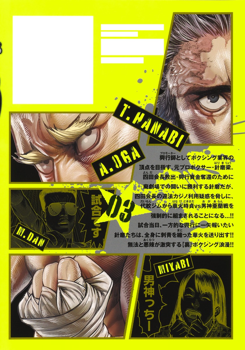 興行師としてボクシング業界の頂点を目指す、元プロボクサー・針磨梁。四田会長救出・興行資金奪還のために廃劇場での闘いに勝利する針磨だが、四田会長の違法カジノ利用疑惑を脅しに、代紋ジムから華火時貞vs男神亜蘭戦を強制的に組まされることになる…!! 試合当日、一方的な興行に一矢報いたい針磨たちは、全身に刺青を纏った華火を送り出す!! 無法と悪辣が激突する【裏】ボクシング浪漫!!