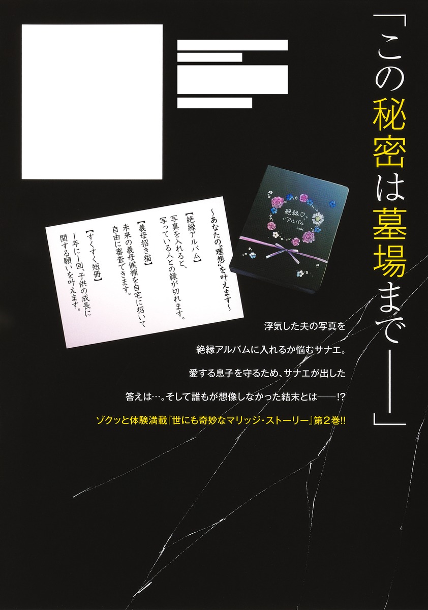 「この秘密は墓場まで──」浮気した夫の写真を絶縁アルバムに入れるか悩むサナエ。愛する息子を守るため、サナエが出した答えは…。そして誰もが想像しなかった結末とは──!?ゾクッと体験満載『世にも奇妙なマリッジ・ストーリー』第2巻!!~あなたの“理想”を叶えます~【絶縁アルバム】写真を入れると、写っている人との縁が切れます。【義母招き猫】未来の義母候補を自宅に招いて自由に審査できます。【すくすく短冊】1年に1回、子供の成長に関する願いを叶えます。
