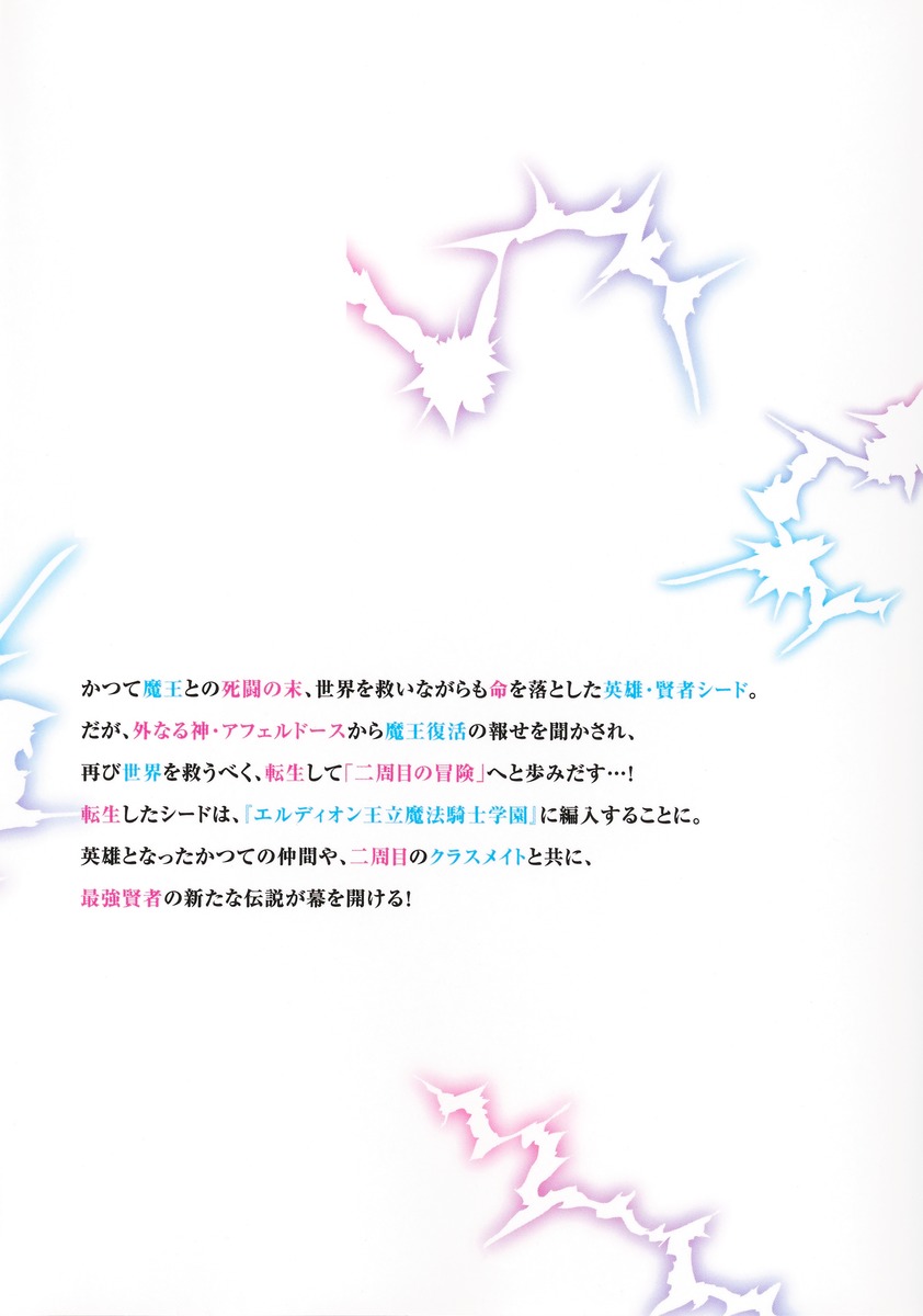 かつて魔王との死闘の末、世界を救いながらも命を落とした英雄・賢者シード。だが、外なる神・アフェルドースから魔王復活の報せを聞かされ、再び世界を救うべく、転生して「二周目の冒険」へと歩みだす…! 転生したシードは、『エルディオン王立魔法騎士学園』に編入することに。英雄となったかつての仲間や、二周目のクラスメイトと共に、最強賢者の新たな伝説が幕を開ける!